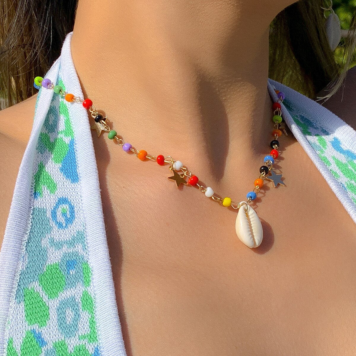 A fun, colorful seed bead necklace inspired by beach vibes, perfect for summer looks and easy layering.